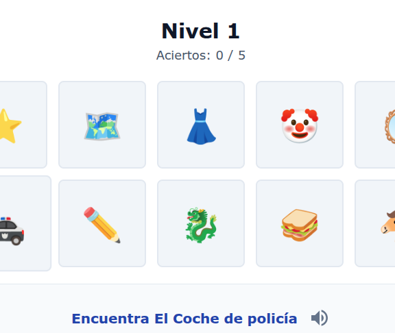 Diseñado específicamente para trabajar la percepción espacial y el vocabulario relacionado con la ubicación. El juego muestra una serie de objetos y pide al usuario que identifique cuál de ellos cumple con una descripción posicional concreta (por ejemplo, "el objeto que está a la derecha de...", "debajo de...", "dentro de..."). Es una actividad fundamental para que los niños desarrollen su comprensión de las relaciones espaciales y aprendan a utilizar correctamente las preposiciones de lugar, una habilidad clave tanto para las matemáticas como para la orientación en el entorno.